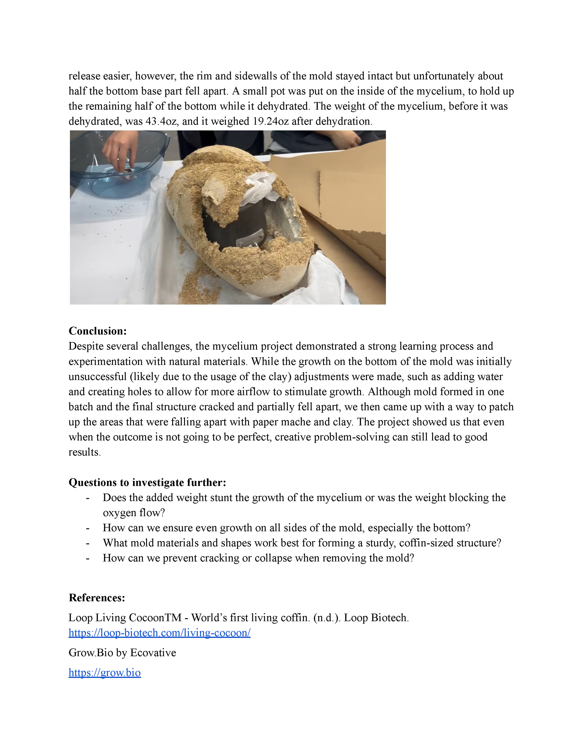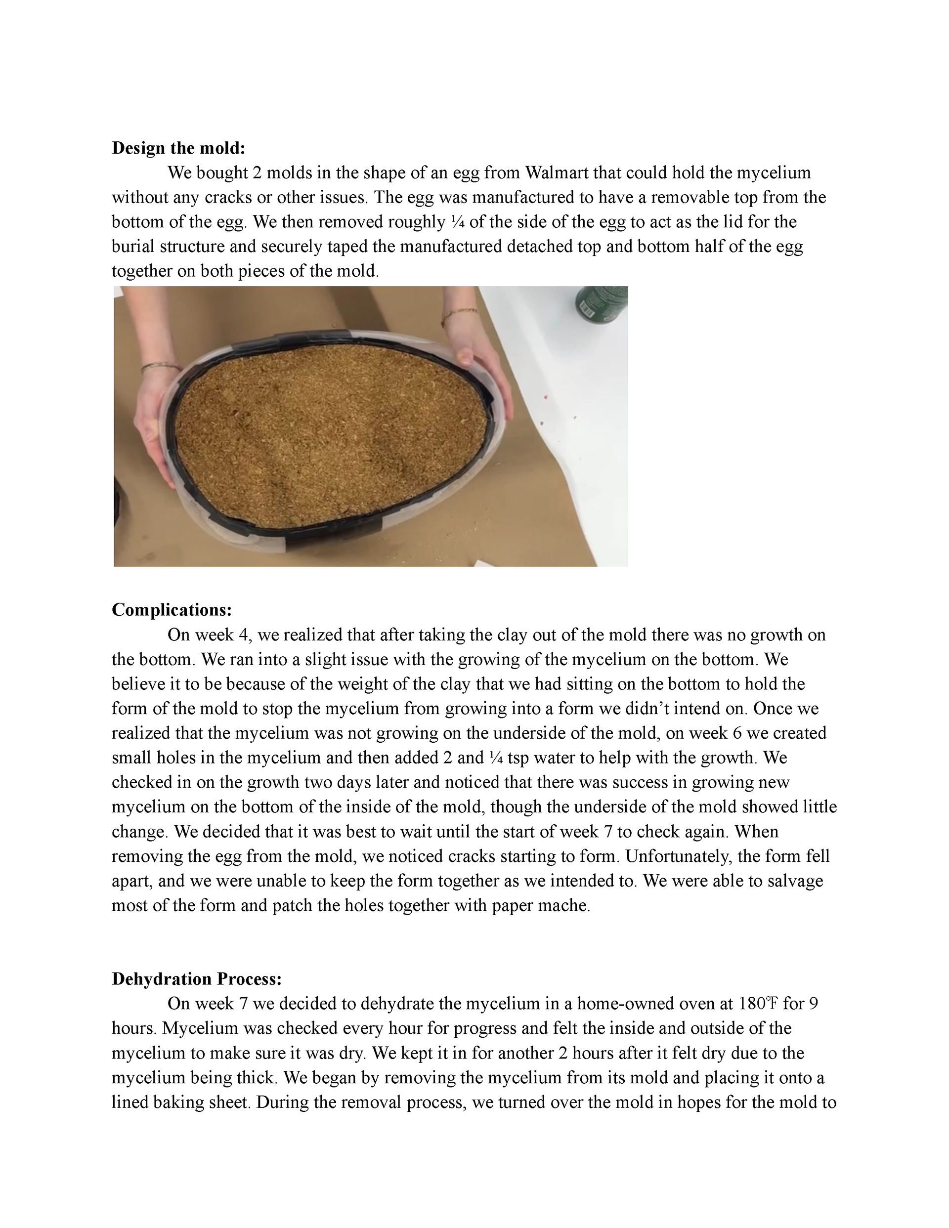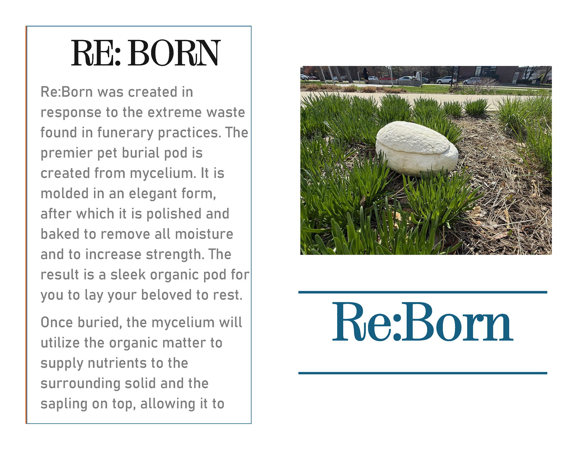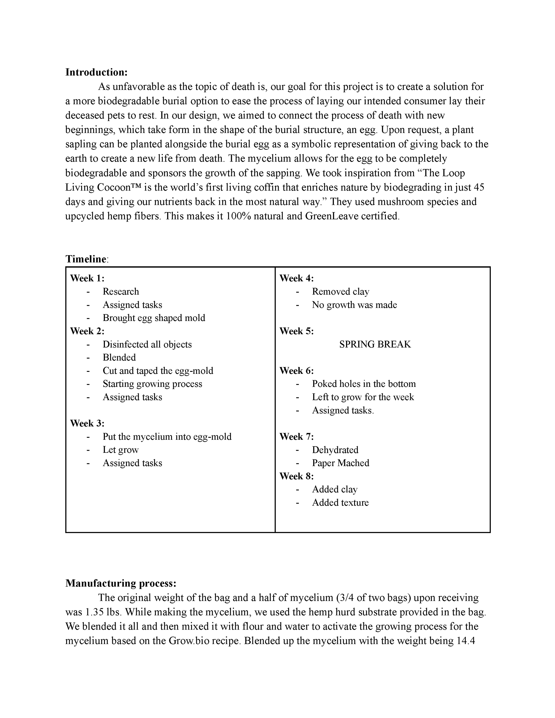 This project was aimed at exploring sustainable materials for industrial design applications. In this project, my team and I explored the use of mycelium in order to create structurally sound, biodegradable burial vessels. I was in charge of product design for this project and created the molds as well as the final mycelium structure. This project really pushed my boundaries, and I learned a great deal about the boundaries of mycelium as a building material.